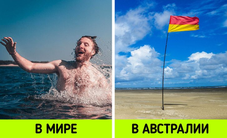 В Австралии огромное количество пляжей, и местные жители с удовольствием проводят там время. Но австралийцы знают, что на пляжах необходимо соблюдать осторожность, ведь там встречаются опасные ситуации — в разные сезоны в некоторых регионах нередко встречаются медузы, акулы, скаты. Можно столкнуться даже с таким явлением, как обратное течение. В мире при виде волн люди сразу же идут плавать, но в Австралии привыкли обращать внимание на сигнальные желтые и красные флаги, которые указывают на безопасность места для купания.