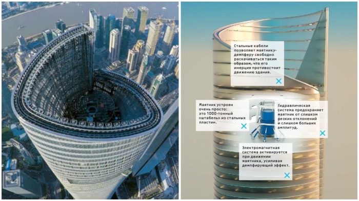 Чтобы у людей не возникал страх и их просто не укачивало, как на корабле, инженеры использовали нестандартную технологию. Наиболее тяжелый груз установили на самых верхних этажах и связали его с сильнейшим электромагнитом. По сути они впервые в строительстве создали индукционный демпфер.
