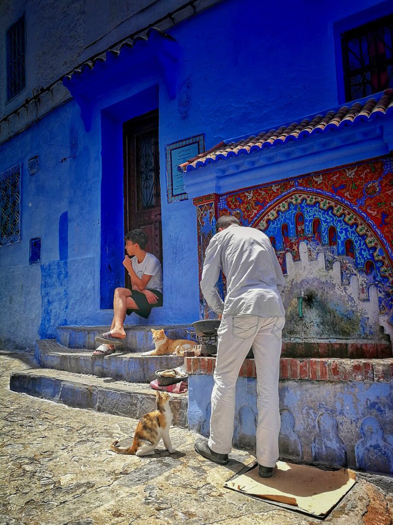 Жизнь течет тут, как и сотни лет назад: голубые лавки распахивают свои двери для покупателей, в голубых чайных предлагают мятный чай и сладости, в голубых мастерских можно выбрать скобяные и другие товары. В городе довольно много художественных салонов — в свое время его облюбовала богема. Картины, художественные фотографии, скульптуры из металла — тут интересно бродить и рассматривать это все. И конечно, кошки. Везде. В любом дворике, в любом магазинчике, в любой лавке, в любом кафе. Вообще кошки в Марокко являются одной из неотъемлемой составляющей любого города.