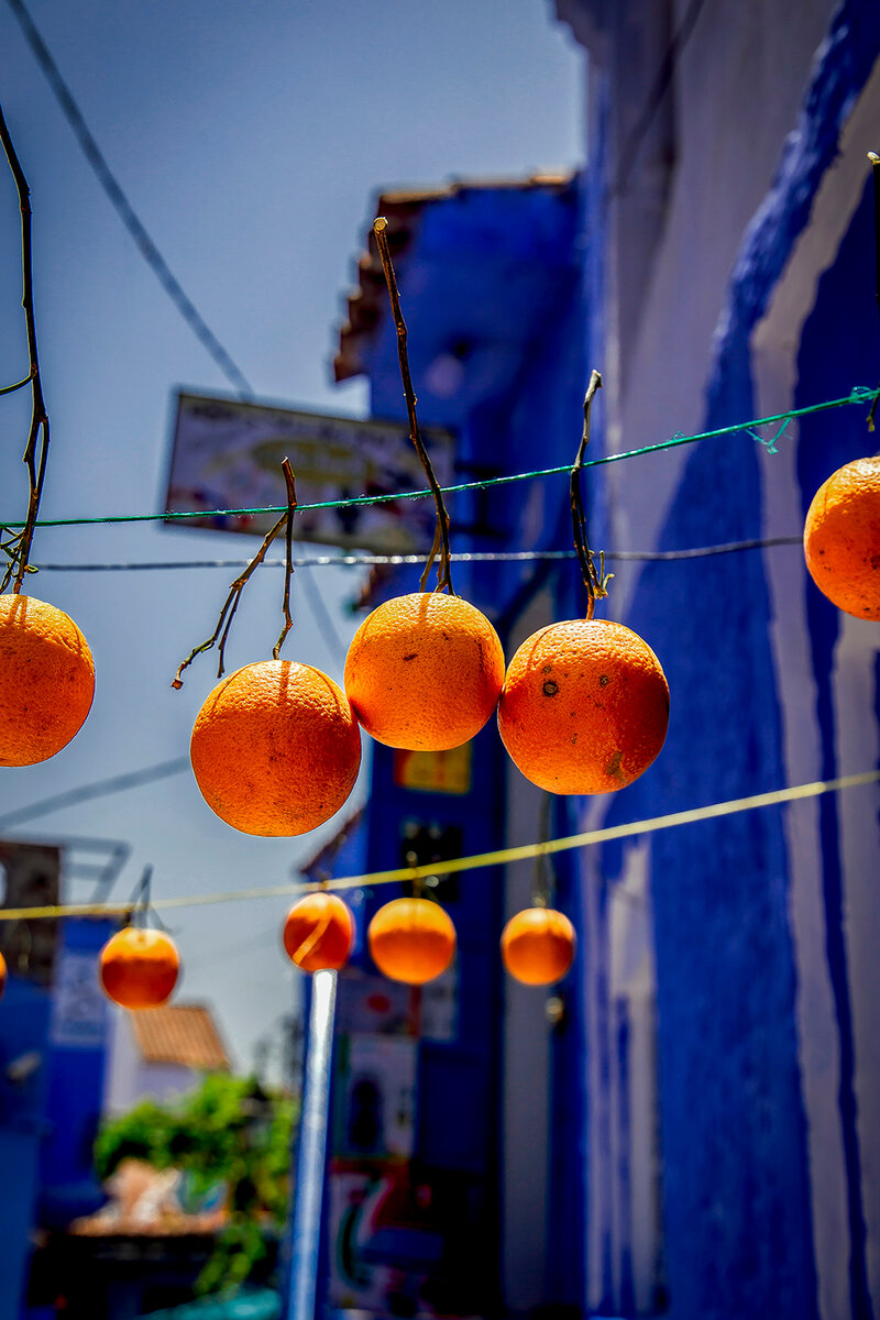 Извилистые узкие улочки голубого цвета, небольшие площади с голубыми лавочками и мандариновыми деревьями, запах гашиша (да, канабис тут активно произрастает на склонах и его используют для изготовления гашиша, который тут же будут активно предлагать купить уличные торговцы, но лучше этого делать) — это все Медина голубого города.
