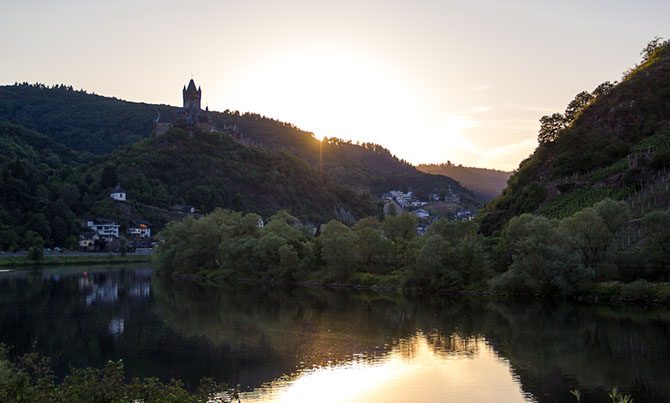 Вечером после вкусного ужина можно прогуляться вдоль Мозеля по променаду и сделать несколько снимков. Замок, правда, расположен так, что золотистые лучи вечернего солнца падают на него не со стороны города, а со стороны леса (при желании можно заранее найти точку съемки где-нибудь к западу от замка), но можно хотя бы вот так снять закат.