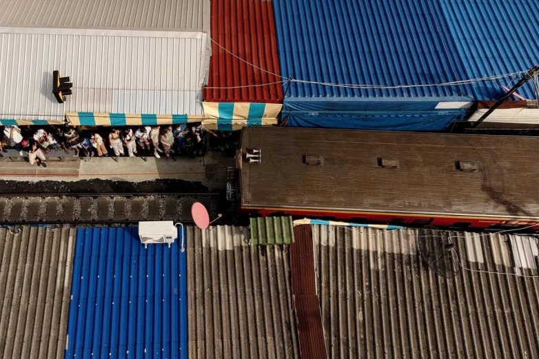 Через несколько секунд на заднем плане появляется поезд, который циркулирует внутри Talad Rom Hub — настоящее название рынка — перед удивленным взглядом посторонних и безразличием местных жителей, привыкших к этим маневрам, которые повторяются восемь раз в день. Расписание этой своеобразной железной дороги включает в себя четыре рейса в каждом направлении.