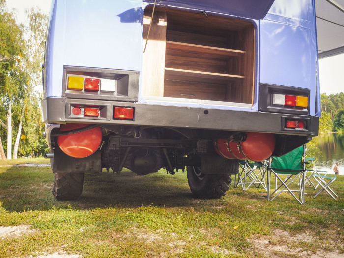 В задней части машины находится санузел, обшитый белым легкомоющимся пластиком. Здесь есть все, чтобы привести себя в порядок после тяжелого путешествия: душ, раковина, биотуалет. Предусмотрены и полочки под предметы гигиены, полотенцесушитель. И это обилие продуманных мелочей присуще для всего салона. Кемпер оснащен двумя спальными местами.