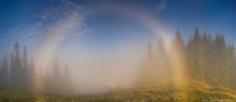 Но нам повезло вдвойне — по центру радуги виднеется еще и Брокенский призрак! Это такое оптическое явление, при котором наблюдатель видит собственную тень, которая в свою очередь лежит на прозрачной среде, рассеивающей свет, например на тумане или облаке.