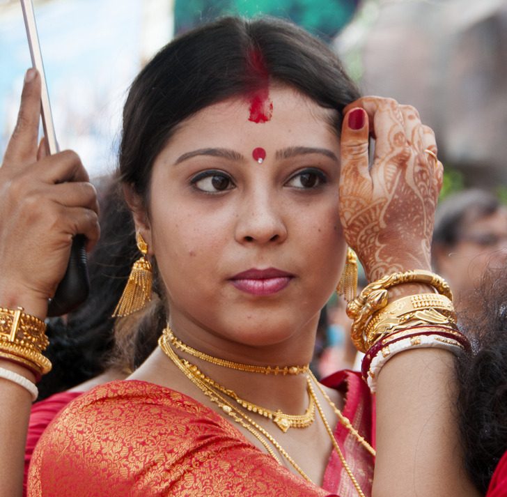 Во время замужества на переднюю часть пробора невесты наносится красная или оранжево-красная косметическая пудра, называемая синдуром. Этот знак издревле служит подтверждением нового статуса, и многие женщины пользуются этим порошком и после свадьбы.
