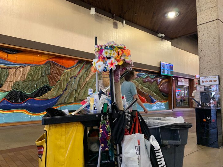 Уборщица в аэропорту украсила свою тележку цветами, которые выбросили путешественники