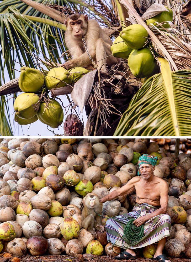16. Специально обученные обезьяны помогают фермерам собирать кокосы