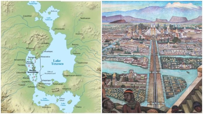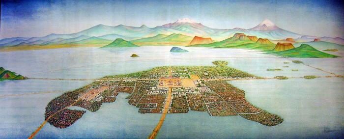 В 1325 г. здесь появилось еще одно племя – ацтеки. Тогда уже берега были озеленены. Новое индейское племя стало жить на озере Тескоко, так был основан Теночтитлан. Эта «озерная столица» имела много насыпных дамб, каналов и мостов. По самому городу текло много рек. О рынке города писали, что он по размерам был больше константинопольского и римского рынков и чище их. От наводнений населенный пункт защищала сложная система, состоящая из дамб, шлюзов и каналов. Так жители регулировали уровень воды.