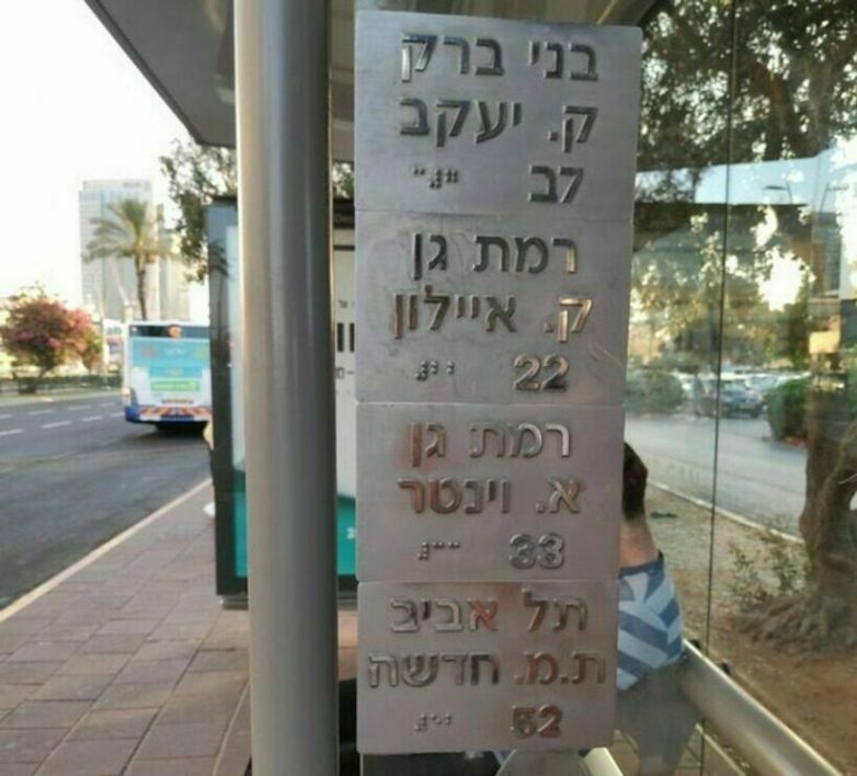На некоторых остановках есть таблички с рельефными надписями, в том числе шрифтом Брайля