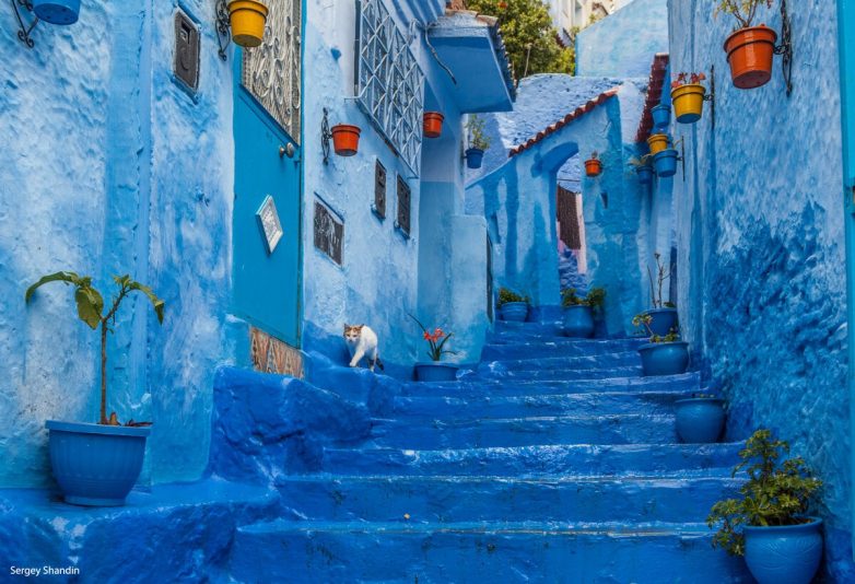 Небесные тона улиц в марокканском городе Шавен кажутся сказочными декорациями. Цветовая палитра поднимающихся в гору зданий изобилует пронзительными оттенками синих, голубых и лазурных цветов. Город, где стены зданий, оконные рамы, деревянные двери домов, ступени и даже цветочные горшки наполнены синевой, является одним из крупнейших туристических центров северного Марокко. Насыщенные оттенки голубой лазури, переходящие в синие и фиолетовые тона, обновляются несколько раз в год. Жители Шавена раскрашивают здания заново перед крупными праздниками и фестивалями, проходящими в городе несколько раз в год.