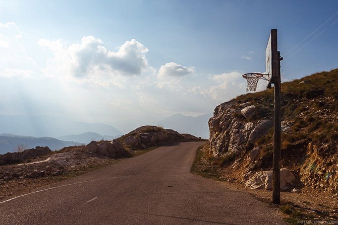 О цивилизации напоминает лишь асфальт серпантина, крошечные домики да одиноко стоящий прямо на дороге баскетбольный щит.