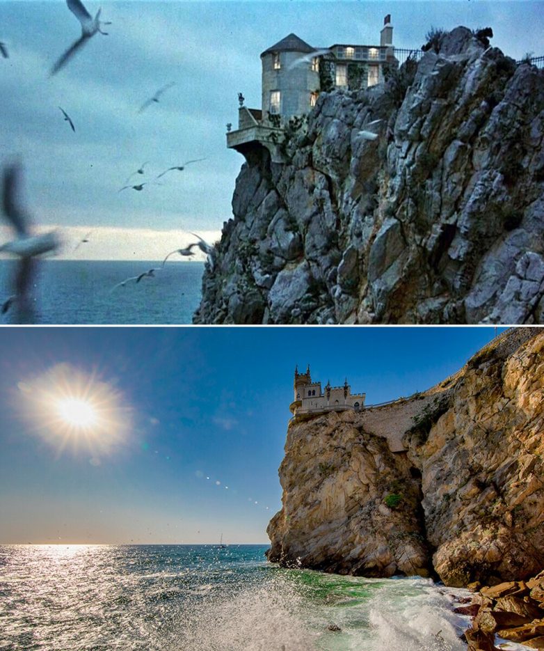 Другие сцены снимали в самом «Ласточкином гнезде» – псевдоготическом замке начала 20 века. Но так как советскому зрителю он хорошо знаком, его тщательно маскировали и не снимали общим планом.