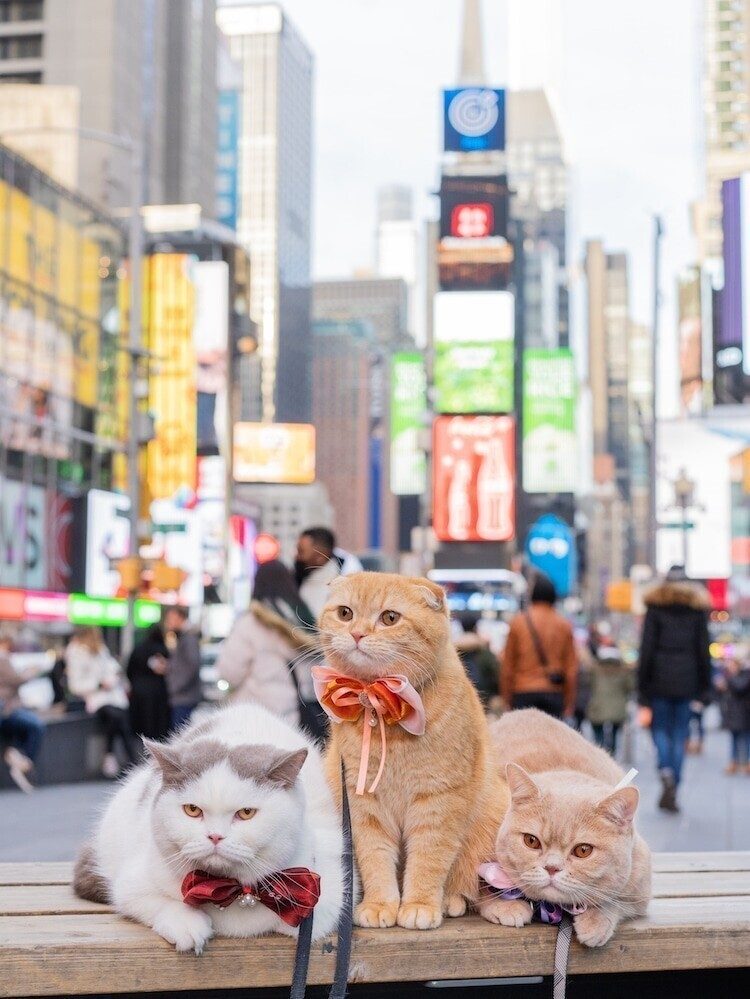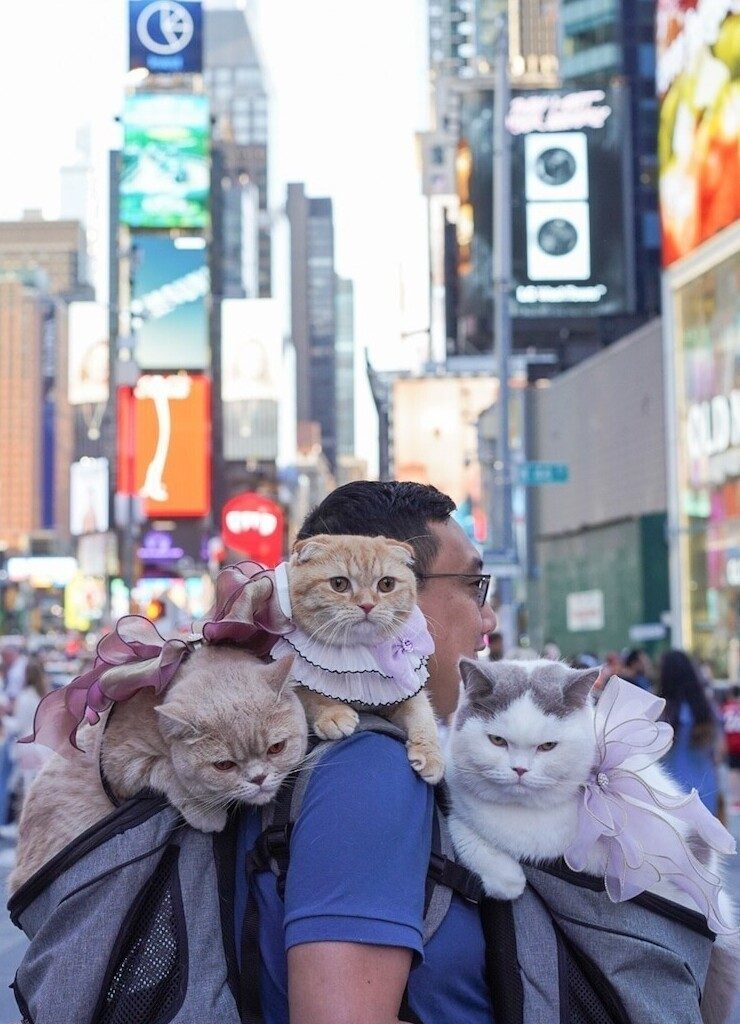 Пара из Нью-Йорка — Дэн и Оливия Нгуен, — обожают своих кошек. В семье целых три пушистых питомца, и хозяева настолько их любят, что берут с собой в путешествия по всему миру. От площади Таймс-сквер в США до Лувра в Париже — эти котейки побывали уже во многих интересных местах. По словам хозяев, они приучили кошек жить в движении, и они спокойно переносят все поездки.