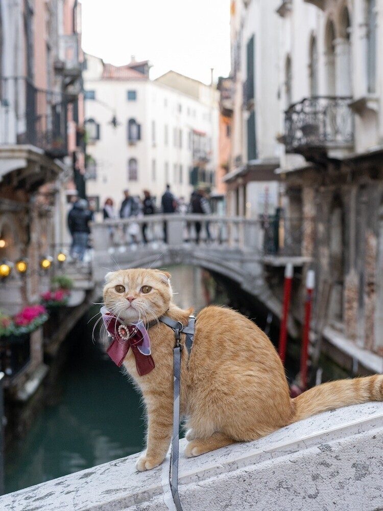 Дэн и Оливия взяли трех кошек из приюта в 2020 году, в разгар пандемии. Они начали постепенно приучать питомцев к улице, а затем и к поездкам. Кроме того, пара постоянно публикует фото с котейками в разных известных местах — они уже стали популярными в соцсетях. У кошек есть особые аксессуары — бантики, благодаря которым их даже узнают на улицах.
