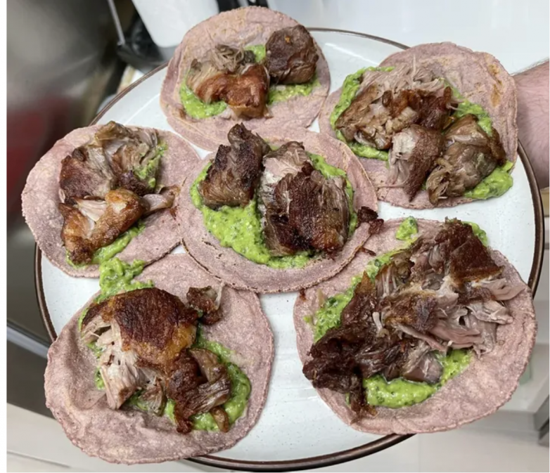 Тако с карнитас от Кенджи на домашней красной тортилье!Для приготовления этого ароматного блюда свинину долго тушат в собственном жиру, а в конце прожаривают. Мясо получается мягким и сочным, а снаружи — хрустящим. Измельченную свинину подают с тортильей, соусом сальса, бобами, гуакамоле, лаймом или свежими овощами.