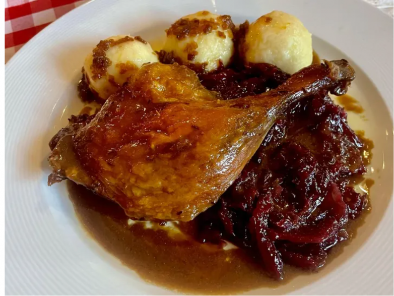 Чешская классика — жареная утка, красная капуста, картофельные кнедлики.