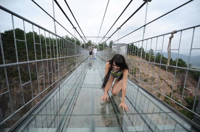 С подвесного моста, соединяющего края каньона в Национальном геологическом парке Синючжай, открываются захватывающие виды, но ступить на него могут только безбашенные туристы. Нужно иметь потрясающее хладнокровие, чтобы идти над пропастью как по воздуху, ведь под ногами – прозрачное стекло.