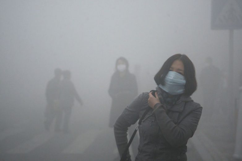 3. Девушка идёт сквозь смог в Пекине, где загрязнение мелкодисперсными частицами в 40 раз превышает безопасный уровень