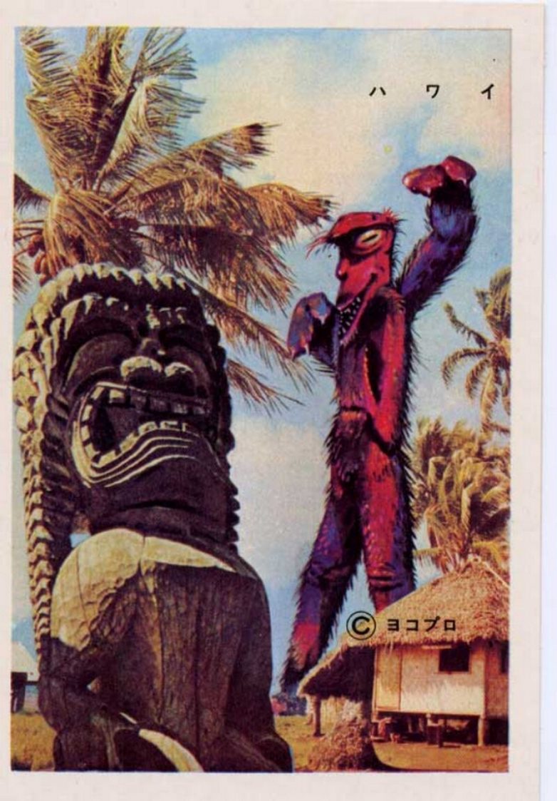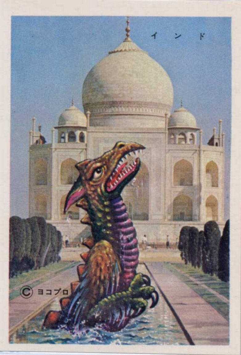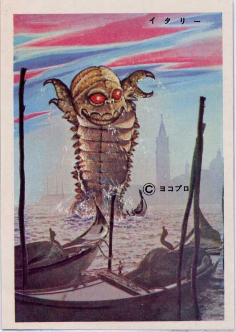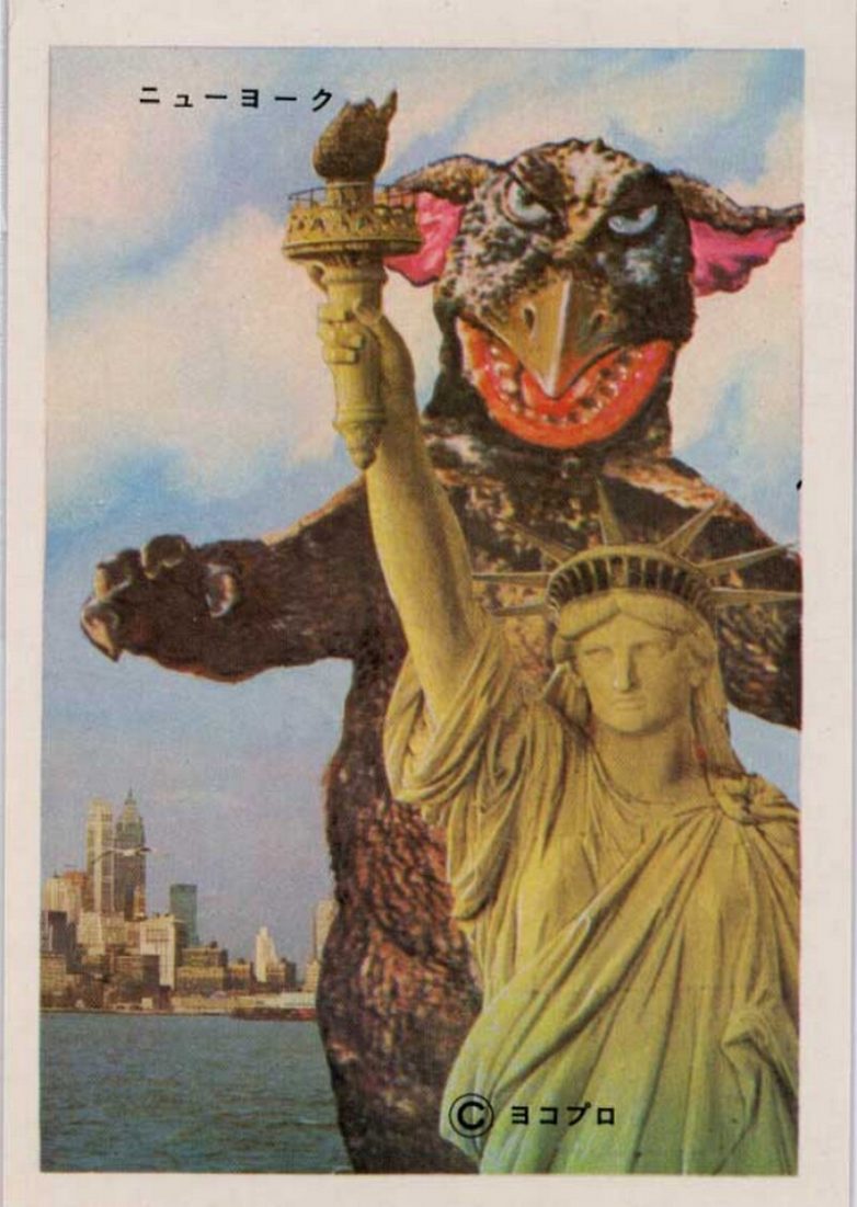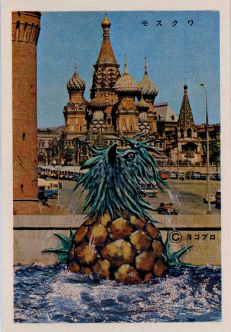 Герои кайдзю часто носили метафорический характер: так, Годзилла олицетворял все страхи японцев перед силой и мощью ядерного оружия. У нас есть материал о том, как вообще появился Годзилла и как он связан с ядерными испытаниями. Но в итоге Годзилла стал больше, чем просто первым персонажем кайдзю: он вдохновил художников рисовать своих чудовищ. Так как официальные монстры были защищены авторскими правами, художники постоянно создавали новых персонажей. Мы отыскали старые открытки, нарисованные во второй половине ХХ века, на которых эти монстры путешествуют по миру. Вы бы хотели себе такую на память из путешествия?