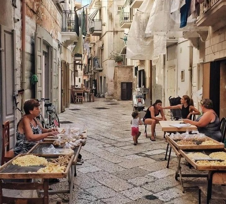 Женщины готовят пасту прямо на улочках. Город Бари