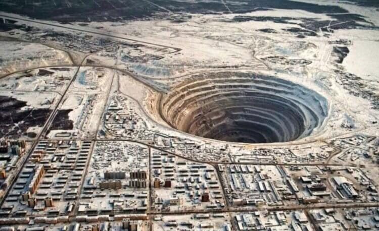 Дело в том, что в городе Мирный находится один из самых крупных в мире карьеров по добыче алмазов. О том, что в Якутии есть месторождение драгоценного минерала, стало известно в 1955 году. Добыча алмазной руды открытым способом производилась на протяжении четырех десятков лет. С 2001 года огромный карьер был оставлен в покое и теперь добычей алмазов занимаются в подземном руднике. Глубина вырытого карьера составляет 525 метров, а диаметр достигает 1,2 километров. Огромная дыра видна из космоса и ее вид, честно говоря, пугает.