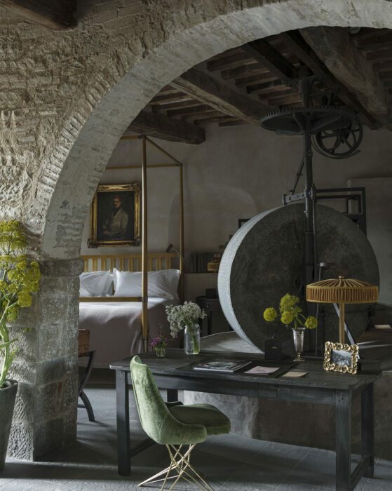 Старинный пресс для оливкового масла настолько колоритный, что стал украшением одного из номеров гостиницы (Castello Di Reschio Hotel, Италия).