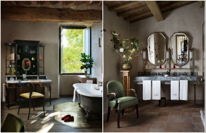 Ванные комнаты оформлены так, чтобы гости могли наслаждаться и водными процедурами, и умиротворяющей обстановкой (Castello Di Reschio Hotel, Италия).