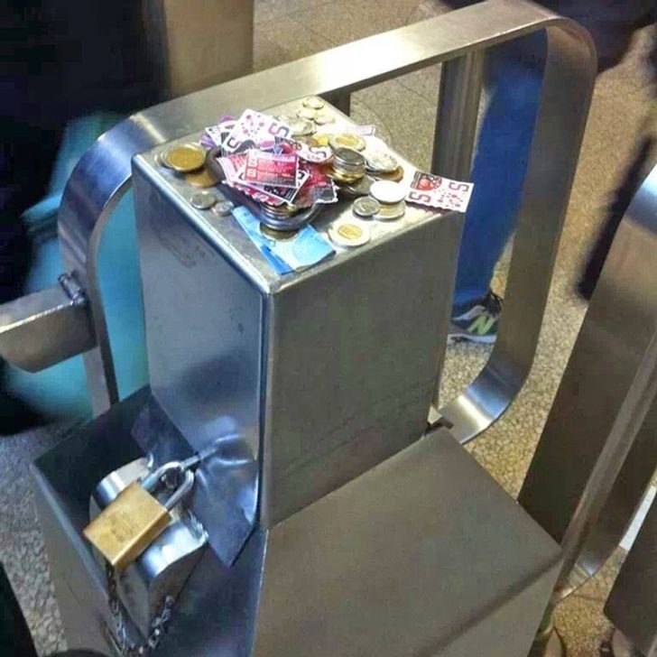 Вот такая кучка мелочи и некомпостированных билетов скопилась на сломанном турникете на одной из станций метро в Канаде, прежде чем работники успели починить его. Если что-то сломалось, вовсе не значит, что можно нарушать закон и ездить бесплатно. По крайней мере, так считают канадцы.