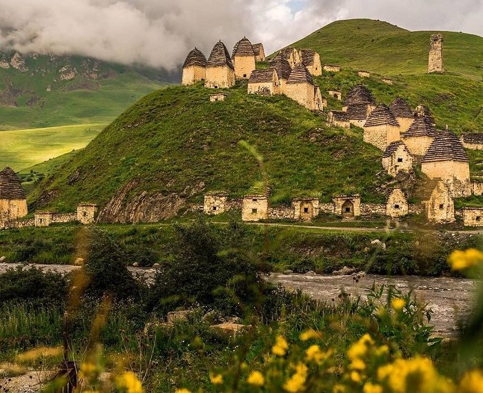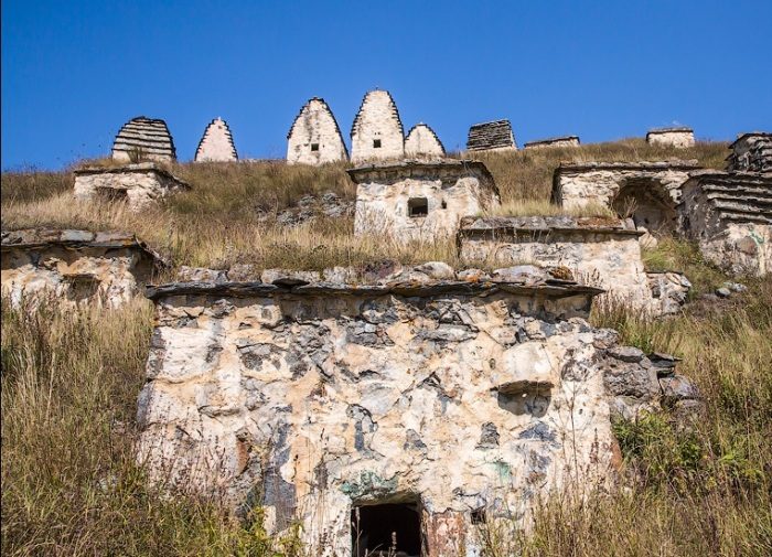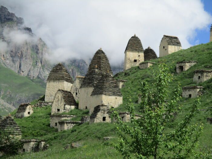 В 40 км от Владикавказа можно увидеть необычное поселение, в котором 99 колоритных домика, разбросанных на живописных горных склонах. Но в нем никто не живет и не потому, что люди по каким-то причинам его покинули навсегда. Оказывается, Даргавс или «Город мертвых» является самым масштабным древним некрополем. Его загадочные избушки с пирамидальными крышами — это семейные склепы, где захоронены десятки поколений, ведь начал он создаваться более 6 столетий назад.