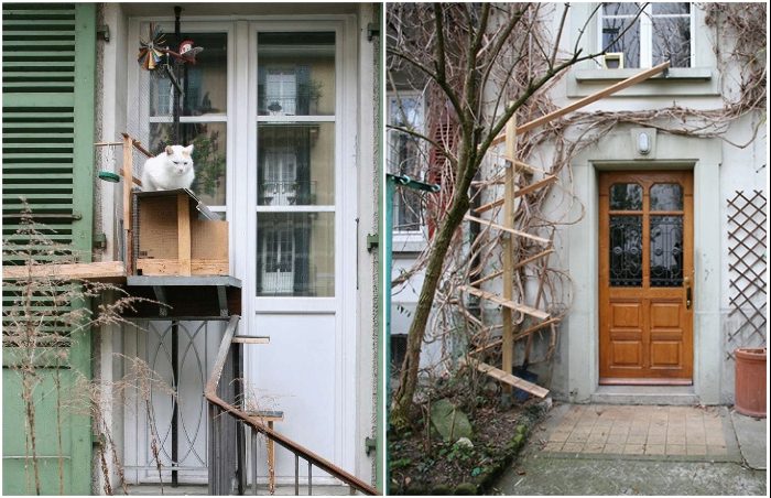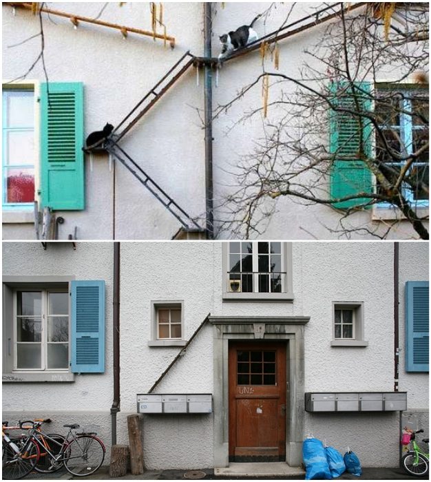 Казалось бы, в большинстве странах мира городские жители тяготеют к этим животным, но никому и в голову не приходит сотворить лестницу или настоящий скалодром для своего питомца. Как правило, усатые шалунишки любым доступным способом сами себя развлекают в квартире, пока хозяева отсутствуют дома. Но вот в Швейцарии настолько заботятся о здоровье и свободе передвижения котов, что готовы понести дополнительные расходы на изготовление лестницы или покупку более изысканных моделей.