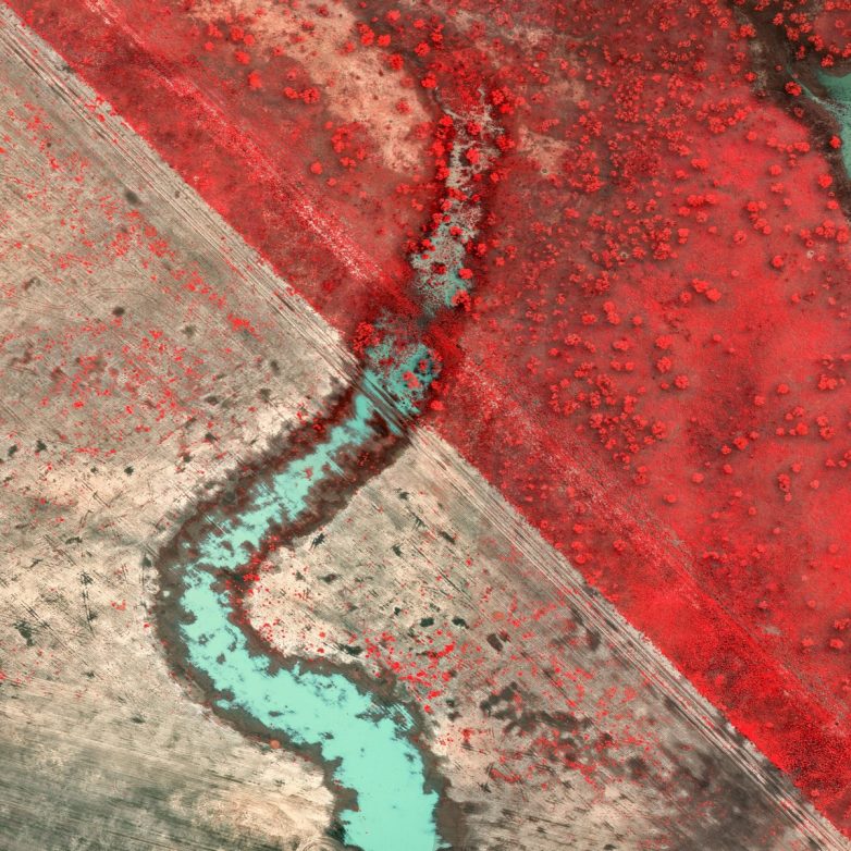 Это облегчает визуализацию масштабов паводковых вод, которые на обычных аэрофотоснимках RGB выглядели бы зелеными или коричневыми на фоне растительности. Этот инфракрасный эффект десятилетиями использовался в научных целях с использованием таких пленок, как Kodak Aerochrome.