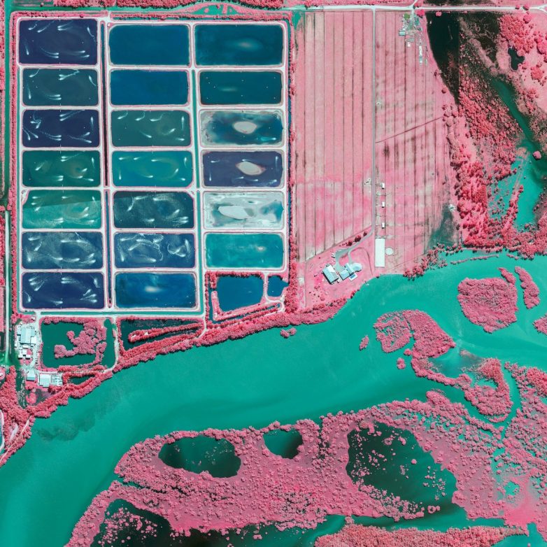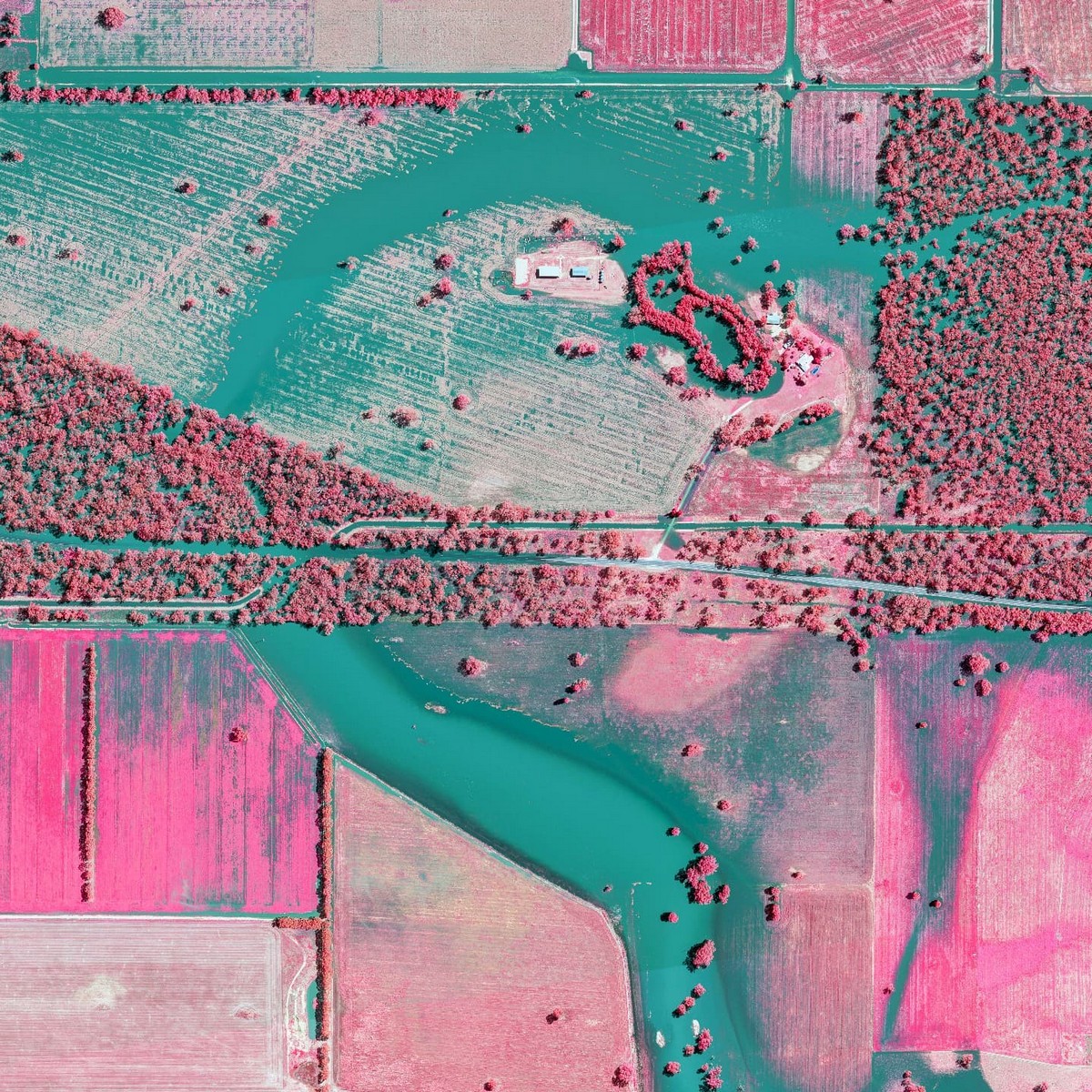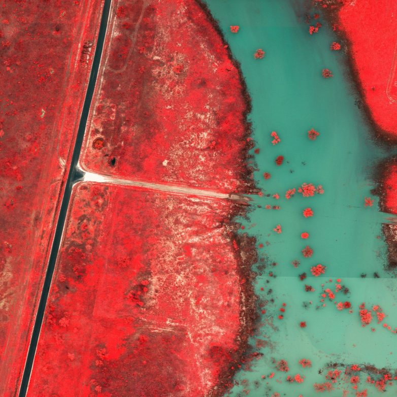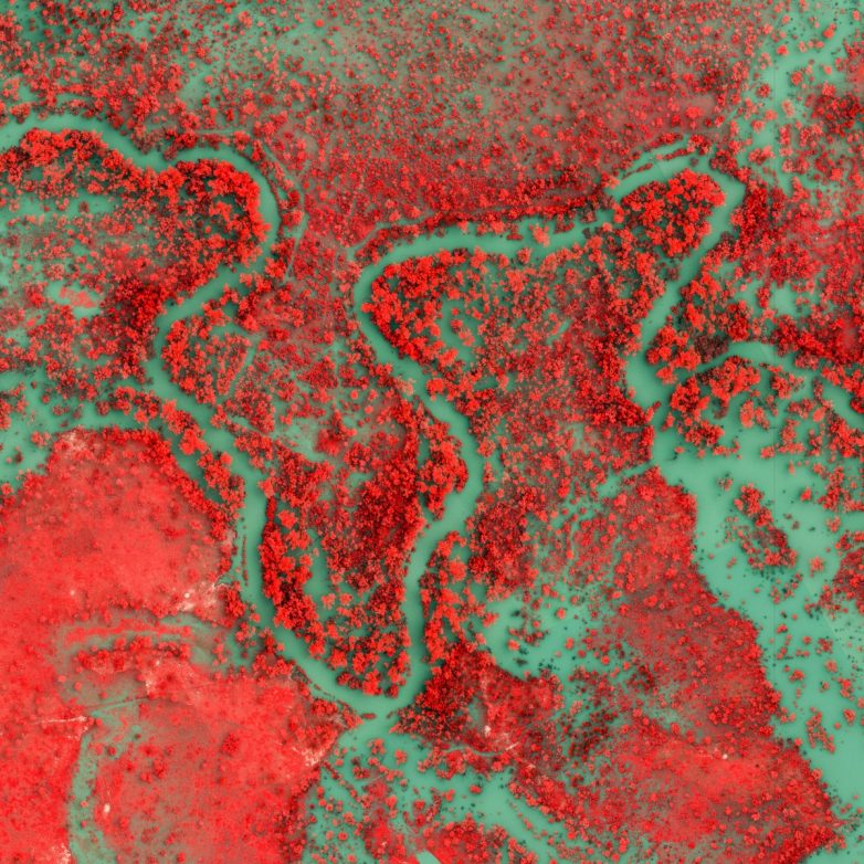 Деревья светятся розовым и красным, поскольку отражают свет в инфракрасной полосе электромагнитного спектра, что сильно контрастирует с водой, которая поглощает длину волны и окрашивается в голубой цвет.