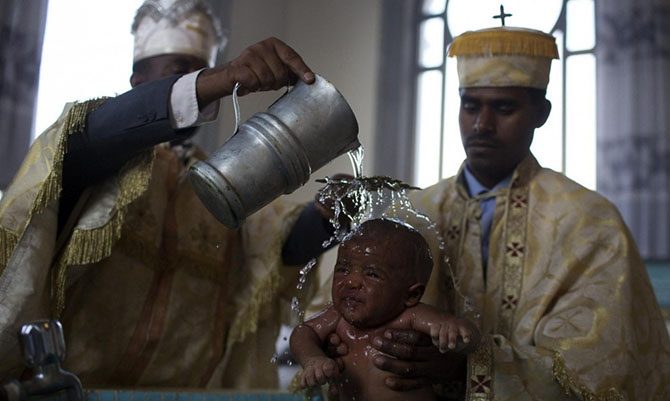 Православные священники совершают обряд крещения в соборе.