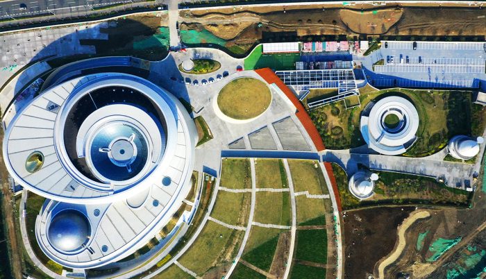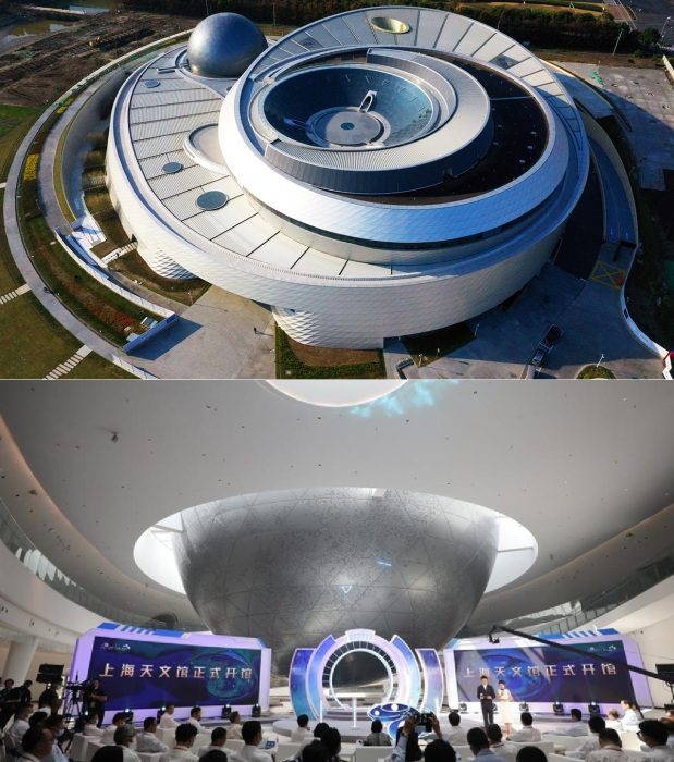 В Шанхае завершилось строительство крупнейшего в мире астрономического музея, «парящего» над землей. Такое необычное ощущение вызывает незаметное внедрение опор, стремление авторов проекта отразить геометрию Вселенной и подчеркнуть динамическую энергию небесного движения. При этом инновационные внедрения помогут переместить посетителей в мир реальных астрономических явлений.