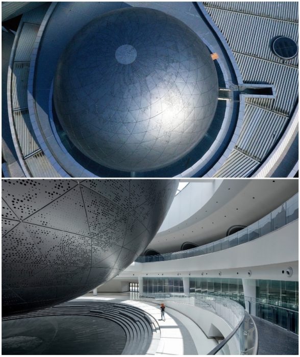 Планетарий имеет форму сферы, которая закреплена так, что зрители не видят массивных опор, поэтому создается впечатление, что планетоподобная структура «парит» над землей. Такая организация пространства еще больше подчеркивает назначение объекта и отсылает к общепризнанным формам нашей Вселенной. Впечатления от полупогруженного в глубину объекта усиливается, когда начинаешь обходить планетарий. Тогда создается стойкое впечатление, что сфера повторяет движение астрономических тел Галактики.