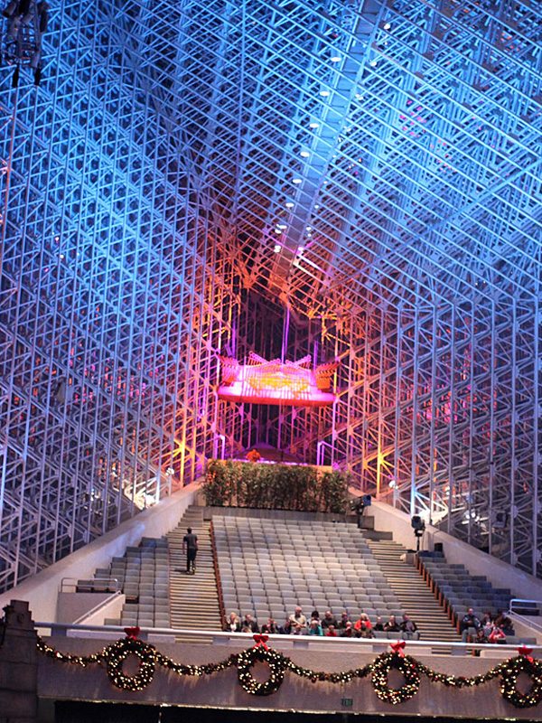 Во внутреннем зале Хрустального собора размещается почти 3000 прихожан и при этом все они могут следить за службой на громадном мониторе Sony Jumbotron.
