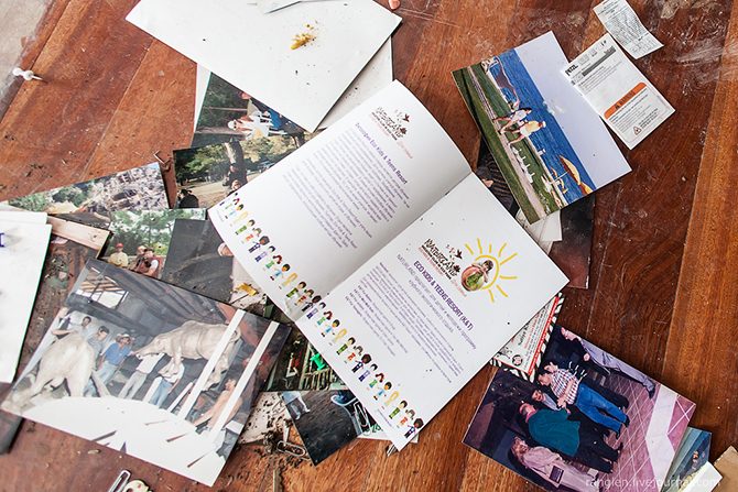 На полу валяются фотографии из жизни отеля, рекламные буклеты и журналы: