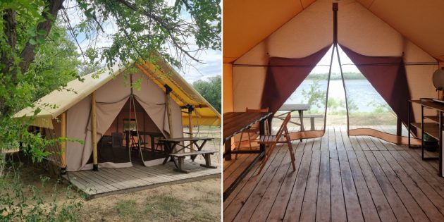 В шатрах и домиках, расположенных на приличном расстоянии друг от друга, ничего не будет мешать комфортному отдыху. Гостям, которые захотят максимального уединения, подойдёт двухместный шатёр на «дереве». Поселившись в нём, в виде бонуса к тишине вы получите возможность наблюдать за косулями. По утрам они собираются у кормушки, которую видно с веранды шатра.