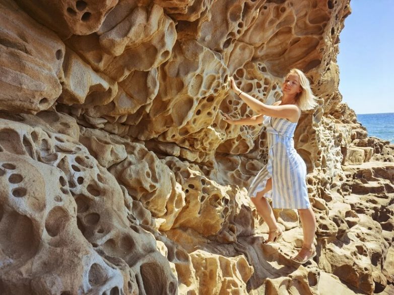 Берег здесь усеян не обычными скалами, а скоплениями кварцитового песчаника. В силу его неоднородного состава часто можно встретить небольшие участки в скале, которые не отличаются прочностью. На этих местах и появляются небольшие дырочки, которые образуются благодаря выветриванию минерала либо же вследствие вымывания морской водой.