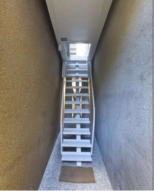 Корпус дома поднят на сваях, а лестница идет верникально от земли