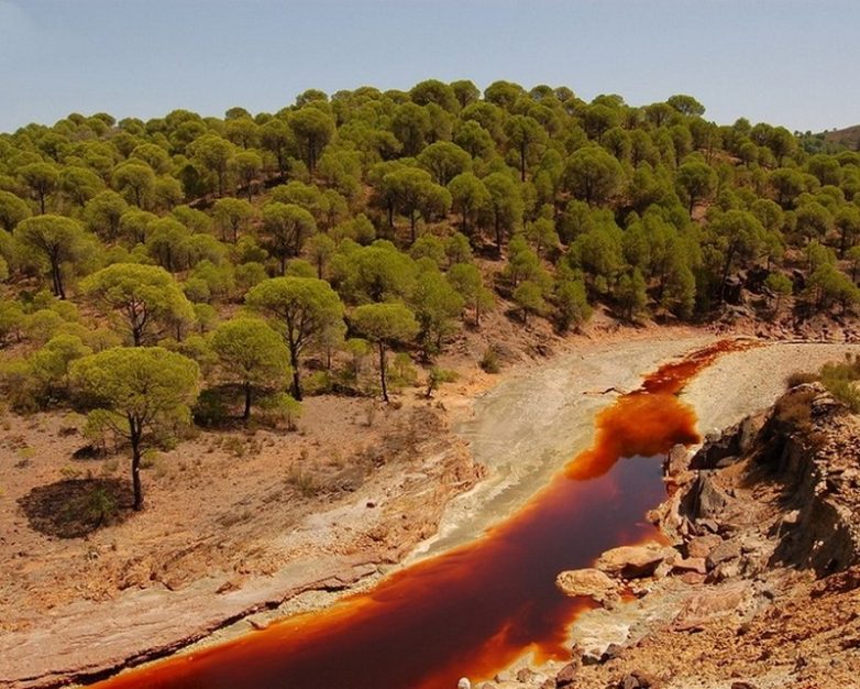 В испанской Андалусии можно найти реку с красным даже кровавым цветом воды. А всё потому, что она ядовита: по информации редакции Novate.ru, её рН равен 2, что делает практически нереальным обитание в ней большей части существующих в природе организмов. Произошло так потому, что на протяжении нескольких столетий люди в этом регионе активно занимались добычей меди, серебра, золота и других полезных ископаемых. Вот в результате этой деятельности и была загрязнена вода в реке — красный цвет она приобретает из-за медь, которая содержится в ней в больших объёмах.
