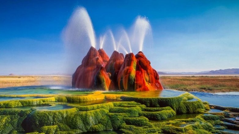 Гейзер Флай в штате Невада кажется уникальным природным чудом, в реальности является постоянно действующим термальным источник, появившимся благодаря человекому воздействию. Произошло это ещё в 1916 году, когда на том месте проводили буровые работы, а полвека спустя подземные воды, в составе которых было много минералов из скважин начали прорываться на поверхность. А результате с подачи человека было создано это удивительное место.