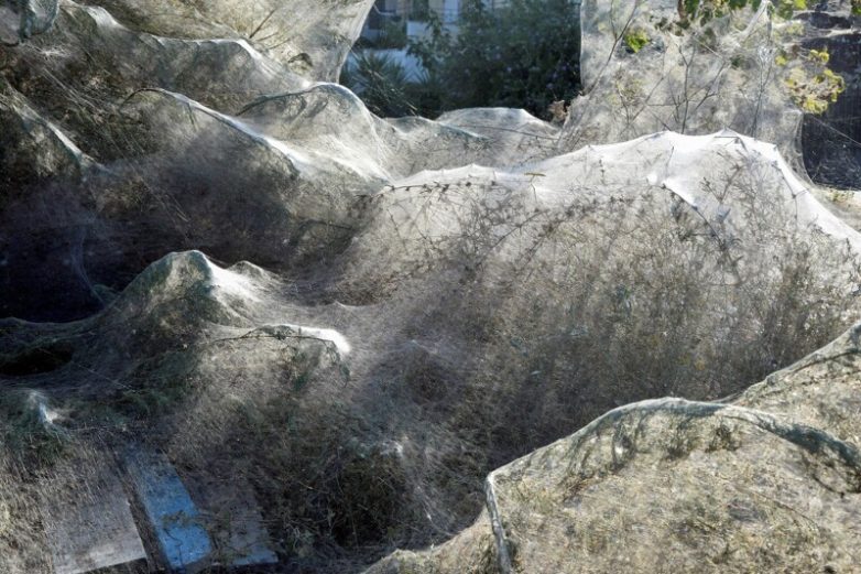 Это не просто маленькие ниточки, которые можно легко смахнуть. Все увито следами пребывания пауков — от кустов до деревьев.