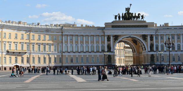 Главная площадь Санкт-Петербурга в два раза больше Красной в Москве — здесь могут поместиться до 35 000 человек. Её обрамляют такие архитектурные памятники: Зимний дворец, Главный штаб и штаб Гвардейского корпуса. В центре возвышается Александровская колонна, посвящённая победе над Наполеоном. Памятник высотой 47,5 м никак не прикреплён к пьедесталу и держится только за счёт своего веса.