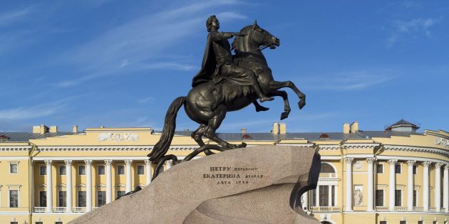 Тот самый памятник Петру I из поэмы А. С. Пушкина на самом деле выполнен из бронзы, а не из меди. Его отлили в 1782 году по указу Екатерины II. Фигура императора стоит на гром-камне — огромном гранитном валуне в виде волны — и, по легенде, указывает в сторону Швеции, которую Пётр I победил в Северной войне.