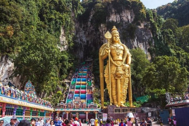 Одно из самых почитаемых мест индуистов за пределами Индии – пещера Бату в лесах Куала-Лумпура, притягивает паломников и туристов со всего мира. Учитывая, что святыня расположена высоко в пещерах скалы, без строительства лестниц не обошлось и главная из них стала яркой достопримечательностью храмового комплекса, равно, как и ее хранитель – гигантская статуя божества Муругана, щедро покрытая золотой краской.