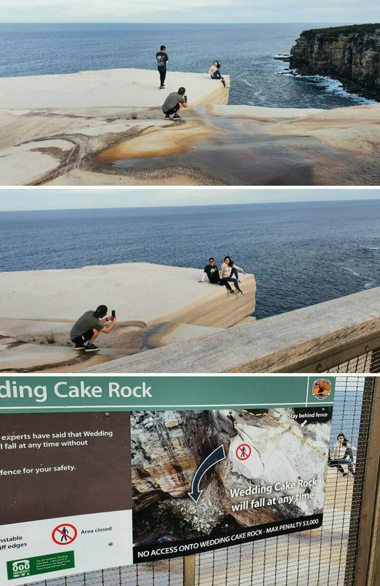 Есть знак, что выходить на скалу опасно, но им нужны красивые снимки