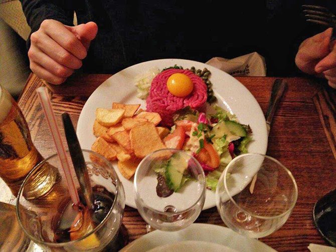 Если ешь сырое мясо, хочется быть уверенным, что оно приготовлено правильно. «Стейк тартар» — рубленое сырое говяжье мясо, подается с луком и каперсами.