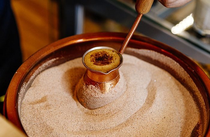 Когда смесь первый раз нагревается, появляется пенка светло-коричневого цвета, которую нужно разложить по чашкам, прежде чем кофе закипит. После этого напиток варится еще около 20 секунд, доводя до кипения два-три раза. Очень важно не давать ему кипеть – каждый раз, когда пенка поднимается, турка достается из песка на несколько секунд, а затем ставится обратно. Готовый кофе разливается по чашкам.