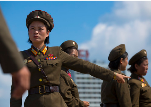 Еще одна «табуированная» фотография военных — на сей раз женщин. В 2015 году в связи с недостатком мужчин призывного возраста женщин тоже стали призывать в армию. В 17 лет все северокорейские девушки должны прибыть на призывной пункт, чтобы отправиться в армию на долгих 7 лет. Условия службы для женщин и мужчин одинаковы, причем одинаково тяжелы: военнослужащие живут в холодных бараках и так же, как и большая часть населения страны, нередко страдают от недоедания, а женщины — еще и от недостатка элементарных средств гигиены.